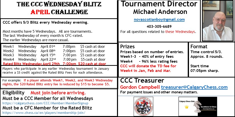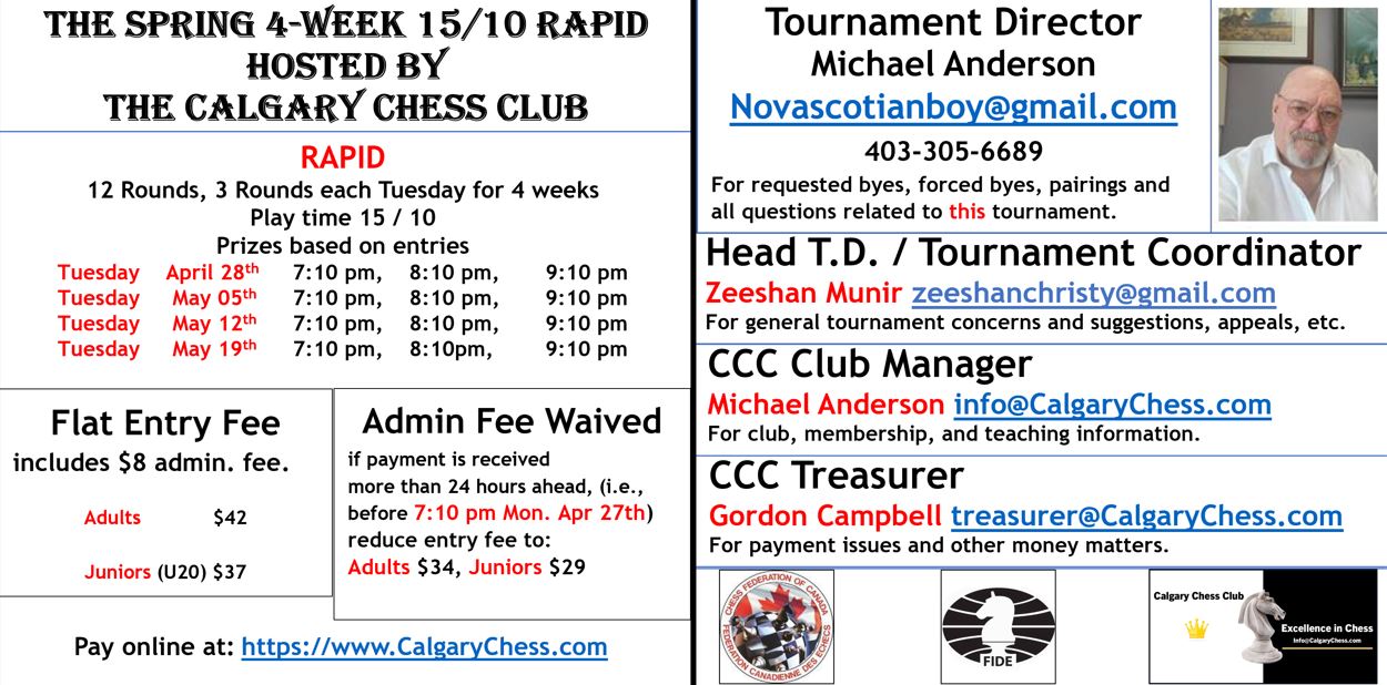 | August | Tue, Aug 12 - 26, 2025 | CCC Rapid Summer Rush 2025 | Calgary Chess Club | Calgary Chess Club |